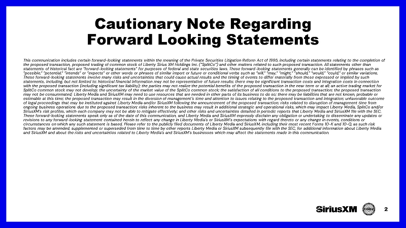 2 Cautionary Note Regarding Forward Looking Statements This communication includes certain forward - looking statements within the meaning of the Private Securities Litigation Reform Ac t of 1995, including certain statements relating to the completion of the proposed transaction, proposed trading of common stock of Liberty Sirius XM Holdings Inc. (“SplitCo”) and other matters r ela ted to such proposed transaction. All statements other than statements of historical fact are “forward - looking statements” for purposes of federal and state securities laws. These forward - looking statements generally can be identified by phrases such as “possible,” “potential,” “intends” or “expects” or other words or phrases of similar import or future or conditional verbs su ch as “will,” “may,” “might,” “should,” “would,” “could,” or similar variations. These forward - looking statements involve many risks and uncertainties that could cause actual results and the timing of events t o differ materially from those expressed or implied by such statements, including, but not limited to: historical financial information may not be representative of future results; ther e m ay be significant transaction costs and integration costs in connection with the proposed transaction (including significant tax liability); the parties may not realize the potential benefits of th e p roposed transaction in the near term or at all; an active trading market for SplitCo common stock may not develop; the uncertainty of the market value of the SplitCo common stock; the satisfaction of al l c onditions to the proposed transaction; the proposed transaction may not be consummated; Liberty Media and SiriusXM may need to use resources that are needed in other parts of its business t o d o so; there may be liabilities that are not known, probable or estimable at this time; the proposed transaction may result in the diversion of management’s time and attention to issues rel ati ng to the proposed transaction and integration; unfavorable outcome of legal proceedings that may be instituted against Liberty Media and/or SiriusXM following the announcement of the proposed tra nsaction; risks related to disruption of management time from ongoing business operations due to the proposed transaction; risks inherent to the business may result in additional strategi c a nd operational risks, which may impact Liberty Media, SplitCo and/or SiriusXM’s risk profiles, which each company may not be able to mitigate effectively; and other risks and uncertainties detai led in periodic reports that Liberty Media and SiriusXM file with the SEC. These forward - looking statements speak only as of the date of this communication, and Liberty Media and SiriusXM expressly discl aim any obligation or undertaking to disseminate any updates or revisions to any forward - looking statement contained herein to reflect any change in Liberty Media’s or SiriusXM’s expectations with regard thereto or any change in events, conditions or circumstances on which any such statement is based. Please refer to the publicly filed documents of Liberty Media and SiriusX M, including their most recent Forms 10 - K and 10 - Q, as such risk factors may be amended, supplemented or superseded from time to time by other reports Liberty Media or SiriusXM subsequently fil e with the SEC, for additional information about Liberty Media and SiriusXM and about the risks and uncertainties related to Liberty Media’s and SiriusXM’s businesses which may affect the sta tements made in this communication.