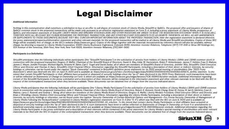 3 Legal Disclaimer Additional Information Nothing in this communication shall constitute a solicitation to buy or an offer to sell shares of common stock of Liberty Me dia , SiriusXM or SplitCo. The proposed offer and issuance of shares of SplitCo common stock in the proposed transactions will be made only pursuant to an effective registration statement on Form S - 4, includ ing a proxy statement of Liberty Media, prospectus of SplitCo, and information statement of SiriusXM. LIBERTY MEDIA AND SIRIUSXM STOCKHOLDERS AND OTHER INVESTORS ARE URGED TO READ TH E REGISTRATION STATEMENT WHEN IT IS AVAILABLE, TOGETHER WITH ALL RELEVANT SEC FILINGS REGARDING THE PROPOSED TRANSACTION, AND ANY OTHER RELEVANT DOCUMENTS FILED AS EXHIBITS TH EREWITH, AS WELL AS ANY AMENDMENTS OR SUPPLEMENTS TO THOSE DOCUMENTS, BECAUSE THEY WILL CONTAIN IMPORTANT INFORMATION ABOUT THE PROPOSED TRANSACTION. After the reg istration statement is declared effective, the proxy statement/prospectus/information statement and other relevant materials for the proposed transaction will be mailed to all Liberty Media and SiriusXM stockholders. Copies of these SEC filings will be available, free of charge, at the SEC’s website (http://www.sec.gov). Copies of the filings together with the ma terials incorporated by reference therein will also be available, without charge, by directing a request to Liberty Media Corporation, 12300 Liberty Boulevard, Englewood, Colorado 80112, Attention: I nve stor Relations, Telephone: (877) 772 - 1518 or Sirius XM Holdings Inc., 1221 Avenue of the Americas, 35th Floor, New York, New York 10021, Attention: Investor Relations, (212) 584 - 5100. Participants in a Solicitation SiriusXM anticipates that the following individuals will be participants (the “SiriusXM Participants”) in the solicitation of pr oxies from holders of Liberty Media’s LSXMA and LSXMB common stock in connection with the proposed transaction Gregory B. Maffei, Chairman of the SiriusXM Board of Directors, David A. Blau , Eddy W. Hartenstein, Robin P. Hickenlooper, James P. Holden, Evan D. Malone, James E. Meyer, Jonelle Procope , Michael Rapino , Kristina M. Salen , Carl E. Vogel and David Zaslav, all of whom are members of SiriusXM’s Board of Directors, Jennifer Witz, SiriusXM’s Chief E xec utive Officer and Director and Thomas D. Barry, SiriusXM’s Chief Financial Officer. Information regarding the SiriusXM Participants , i ncluding a description of their direct or indirect interests, by security holdings or otherwise, can be found under the caption “Stock Ownership” contained in SiriusXM’s definitive proxy statement fo r i ts 2023 annual meeting of stockholders (the “2023 Proxy Statement”), which was filed with the SEC on April 21, 2023 and is available at: https://www.sec.gov/ix?doc=/Archives/edgar/d ata /908937/000093041323001281/c105679_def14a - ixbrl.htm. To the extent that certain SiriusXM Participants or their affiliates have acquired or disposed of security holdings since the “as of ” d ate disclosed in the 2023 Proxy Statement, such transactions have been or will be reflected on Statements of Change in Ownership on Form 4, which are available at: https://www.sec.gov/edgar/browse /?C IK=908937&owner=exclude. Additional information regarding certain of the SiriusXM Participants in the proxy solicitation and a description of their interests will be contained in the inf ormation statement and other relevant materials to be filed with the SEC in respect of the contemplated transactions when they become available. These documents can be obtained free of charge from the sou rces indicated above. Liberty Media anticipates that the following individuals will be participants (the “Liberty Media Participants”) in the solic ita tion of proxies from holders of Liberty Media’s LSXMA and LSXMB common stock in connection with the proposed transaction: John C. Malone, Chairman of the Liberty Media Board of Directors, Robert R . B ennett, Derek Chang, Brian M. Deevy , M. Ian G. Gilchrist, Evan D. Malone, Larry E. Romrell , and Andrea L. Wong, all of whom are members of the Liberty Media Board of Directors, Gregory B. Maffei, Liberty Media’s Pre sid ent, Chief Executive Officer and Director, and Brian J. Wendling, Liberty Media’s Chief Accounting Officer and Principal Financial Officer. Information regarding the Libert y M edia Participants, including a description of their direct or indirect interests, by security holdings or otherwise, can be found under the caption “Security Ownership of Certain Beneficial Owners an d Management — Pro Forma Security Ownership of Management of Liberty Media Following the Reclassification” contained in Liberty Media’s registration statement on Form S - 4 (the “S - 4”), which was filed with the SEC on June 8, 2023 and is available at: https://www.sec.gov/Archives/edgar/data/1560385/000110465923069028/tm2232384 - 33_s4a.htm. To the extent that certain Liberty Medi a Participants or their affiliates have acquired or disposed of security holdings since the “as of” date disclosed in the S - 4, such transactions have been or will be reflected on S tatements of Change in Ownership on Form 4 or amendments to beneficial ownership reports on Schedules 13D filed with the SEC, which are available at: https://www.sec.gov/edgar/browse/?C IK= 1560385&owner=exclude. Additional information regarding the Liberty Media Participants in the proxy solicitation and a description of their interests will be contained in the proxy stat eme nt for Liberty Media’s special meeting of stockholders and other relevant materials to be filed with the SEC in respect of the contemplated transactions when they become available. These documents ca n b e obtained free of charge from the sources indicated above.