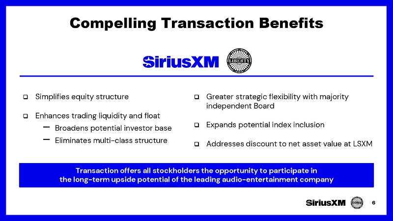 5 $0.00 $1.00 $2.00 $3.00 $4.00 $5.00 $6.00 $7.00 $8.00 $9.00 $10.00 Feb-09 Feb-10 Feb-11 Feb-12 Feb-13 Feb-14 Feb-15 Feb-16 Feb-17 Feb-18 Feb-19 Feb-20 Feb-21 Feb-22 Feb-23 Significant Value Creation for All Investors ($) February 13, 2009 – December 11, 2023 February 2009: Initial Liberty Investment SiriusXM Total Shareholder Returns (1) Note: Rebased to SiriusXM share price of $0.10 as of February 13, 2009 (1) Assumes dividends are reinvested as received at the prevailing market price