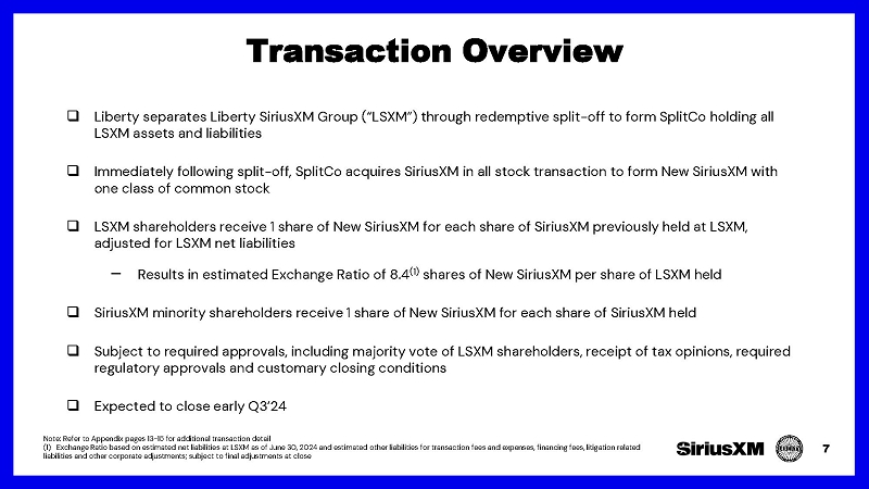 6 Compelling Transaction Benefits □ Simplifies equity structure □ Enhances trading liquidity and float – Broadens potential investor base – Eliminates multi - class structure □ Greater strategic flexibility with majority independent Board □ Expands potential index inclusion □ Addresses discount to net asset value at LSXM Transaction offers all stockholders the opportunity to participate in the long - term upside potential of the leading audio - entertainment company