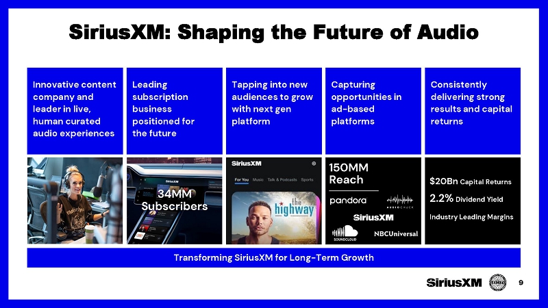8 Streamlined Ownership Structure Post Merger Structure Current Structure LSXMA Shares LSXMB Shares LSXMK Shares SiriusXM Public Shareholders SiriusXM Current Shares: 3,839MM (1) 16% 84% Former Liberty SiriusXM Shareholders Former SiriusXM Public Shareholders “New SiriusXM” Pro Forma Shares: 3,392MM (2) 19% 81% (1) Current SIRI share count as of October 27, 2023, per latest 10 - Q. Excludes impact of potentially dilutive securities, including existing SiriusXM equity awards (2) Pro forma share count based on current SIRI share count, LSXM share count as of December 8, 2023, and estimated Exchange Rati o o f 8.4. Excludes impact of potentially dilutive securities, including existing SiriusXM equity awards, LSXM equity awards, and the market value above principal of the 3.75% LSX M convertible notes Liberty SiriusXM Group Liberty Media Corporation