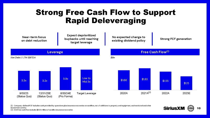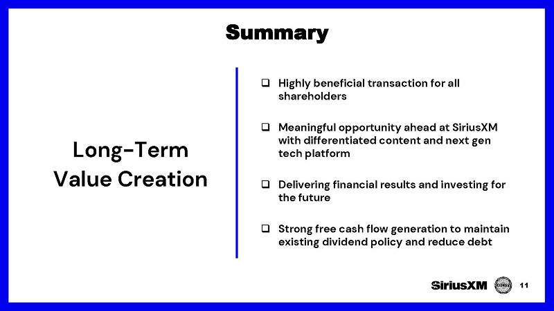10 3.3x 3.2x 3.9x Low to Mid 3s 9/30/23 (Status Quo) 12/31/23E (Status Quo) 6/30/24E (Pro Forma) Target Leverage $1.66 $1.83 $1.55 $1.15 2020A 2021A 2022A 2023E Free Cash Flow (1) $Bn Strong Free Cash Flow to Support Rapid Deleveraging Leverage Net Debt / LTM EBITDA No expected change to existing dividend policy Expect deprioritized buybacks until reaching target leverage Near - term focus on debt reduction (1) Company - defined FCF includes cash provided by operations plus insurance recoveries on satellites, net of additions to property a nd equipment, and restricted and other investment activity (2) 2021 free cash flow includes $225 million of satellite insurance recoveries Strong FCF generation (2)