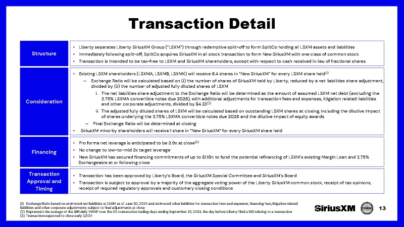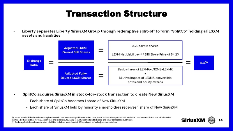 13 Transaction Detail Structure • Liberty separates Liberty SiriusXM Group (“LSXM”) through redemptive split - off to form SplitCo holding all LSXM assets and liabi lities • Immediately following split - off, SplitCo acquires SiriusXM in all stock transaction to form New SiriusXM with one class of commo n stock • Transaction is intended to be tax - free to LSXM and SiriusXM shareholders, except with respect to cash received in lieu of fracti onal shares Consideration • Existing LSXM shareholders (LSXMA, LSXMB, LSXMK) will receive 8.4 shares in “New SiriusXM” for every LSXM share held (1) ‒ Exchange Ratio will be calculated based on (i) the number of shares of SiriusXM held by Liberty, reduced by a net liabilities sh are adjustment, divided by (ii) the number of adjusted fully diluted shares of LSXM i. The net liabilities share adjustment to the Exchange Ratio will be determined as the amount of assumed LSXM net debt (excludi ng the 3.75% LSXMA convertible notes due 2028), with additional adjustments for transaction fees and expenses, litigation related li abi lities and other corporate adjustments, divided by $4.23 (2) ii. The adjusted fully diluted shares of LSXM will be calculated based on outstanding LSXM shares at closing, including the dilut ive impact of shares underlying the 3.75% LSXMA convertible notes due 2028 and the dilutive impact of equity awards ‒ Final Exchange Ratio will be determined at closing • SiriusXM minority shareholders will receive 1 share in “New SiriusXM” for every SiriusXM share held Financing • Pro forma net leverage is anticipated to be 3.9x at close (3) • No change to low - to - mid 3x target leverage • New SiriusXM has secured financing commitments of up to $1.1Bn to fund the potential refinancing of LSXM’s existing Margin Loan and 2.75% Exchangeable at or following close Transaction Approval and Timing • Transaction has been approved by Liberty’s Board, the SiriusXM Special Committee and SiriusXM’s Board • Transaction is subject to approval by a majority of the aggregate voting power of the Liberty SiriusXM common stock, receipt of tax opinions, receipt of required regulatory approvals and customary closing conditions (1) Exchange Ratio based on estimated net liabilities at LSXM as of June 30, 2024 and estimated other liabilities for transaction fe es and expenses, financing fees, litigation related liabilities and other corporate adjustments; subject to final adjustments at close (2) Represents the average of the SIRI daily VWAP over the 20 consecutive trading days ending September 25, 2023, the day before Lib erty filed a 13D relating to a transaction (3) Transaction expected to close early Q3’24