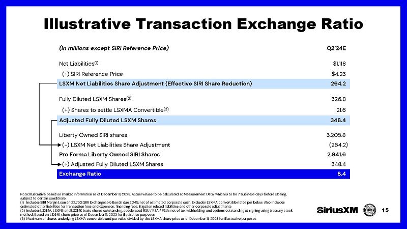 14 Transaction Structure • Liberty separates Liberty SiriusXM Group through redemptive split - off to form “SplitCo” holding all LSXM assets and liabilities Exchange Ratio = Adjusted LSXM - Owned SIRI Shares Adjusted Fully - Diluted LSXM Shares = = 3,205.8MM shares – LSXM Net Liabilities (1) / SIRI Share Price of $4.23 Basic shares of LSXMA+LSXMB+LSXMK + Dilutive Impact of LSXMA convertible notes and equity awards 8.4 (2) • SplitCo acquires SiriusXM in stock - for - stock transaction to create New SiriusXM − Each share of SplitCo becomes 1 share of New SiriusXM − Each share of SiriusXM held by minority shareholders receives 1 share of New SiriusXM (1) LSXM Net Liabilities include SIRI Margin Loan and 2.75% SIRI Exchangeable Bonds due 2049, net of estimated corporate cash. Ex clu des LSXMA convertible notes. Also includes estimated other liabilities for transaction fees and expenses, financing fees, litigation related liabilities and other corpo rat e adjustments (2) Exchange Ratio based on estimated LSXM Net Liabilities as of June 30, 2024, subject to final adjustments at close =