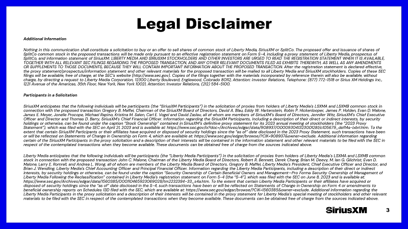 3 Legal Disclaimer Additional Information Nothing in this communication shall constitute a solicitation to buy or an offer to sell shares of common stock of Liberty Me dia , SiriusXM or SplitCo. The proposed offer and issuance of shares of SplitCo common stock in the proposed transactions will be made only pursuant to an effective registration statement on Form S - 4, includ ing a proxy statement of Liberty Media, prospectus of SplitCo, and information statement of SiriusXM. LIBERTY MEDIA AND SIRIUSXM STOCKHOLDERS AND OTHER INVESTORS ARE URGED TO READ TH E REGISTRATION STATEMENT WHEN IT IS AVAILABLE, TOGETHER WITH ALL RELEVANT SEC FILINGS REGARDING THE PROPOSED TRANSACTION, AND ANY OTHER RELEVANT DOCUMENTS FILED AS EXHIBITS TH EREWITH, AS WELL AS ANY AMENDMENTS OR SUPPLEMENTS TO THOSE DOCUMENTS, BECAUSE THEY WILL CONTAIN IMPORTANT INFORMATION ABOUT THE PROPOSED TRANSACTION. After the reg istration statement is declared effective, the proxy statement/prospectus/information statement and other relevant materials for the proposed transaction will be mailed to all Liberty Media and SiriusXM stockholders. Copies of these SEC filings will be available, free of charge, at the SEC’s website (http://www.sec.gov). Copies of the filings together with the ma terials incorporated by reference therein will also be available, without charge, by directing a request to Liberty Media Corporation, 12300 Liberty Boulevard, Englewood, Colorado 80112, Attention: I nve stor Relations, Telephone: (877) 772 - 1518 or Sirius XM Holdings Inc., 1221 Avenue of the Americas, 35th Floor, New York, New York 10021, Attention: Investor Relations, (212) 584 - 5100. Participants in a Solicitation SiriusXM anticipates that the following individuals will be participants (the “SiriusXM Participants”) in the solicitation of pr oxies from holders of Liberty Media’s LSXMA and LSXMB common stock in connection with the proposed transaction Gregory B. Maffei, Chairman of the SiriusXM Board of Directors, David A. Blau , Eddy W. Hartenstein, Robin P. Hickenlooper, James P. Holden, Evan D. Malone, James E. Meyer, Jonelle Procope , Michael Rapino , Kristina M. Salen , Carl E. Vogel and David Zaslav, all of whom are members of SiriusXM’s Board of Directors, Jennifer Witz, SiriusXM’s Chief E xec utive Officer and Director and Thomas D. Barry, SiriusXM’s Chief Financial Officer. Information regarding the SiriusXM Participants , i ncluding a description of their direct or indirect interests, by security holdings or otherwise, can be found under the caption “Stock Ownership” contained in SiriusXM’s definitive proxy statement fo r i ts 2023 annual meeting of stockholders (the “2023 Proxy Statement”), which was filed with the SEC on April 21, 2023 and is available at: https://www.sec.gov/ix?doc=/Archives/edgar/d ata /908937/000093041323001281/c105679_def14a - ixbrl.htm. To the extent that certain SiriusXM Participants or their affiliates have acquired or disposed of security holdings since the “as of ” d ate disclosed in the 2023 Proxy Statement, such transactions have been or will be reflected on Statements of Change in Ownership on Form 4, which are available at: https://www.sec.gov/edgar/browse /?C IK=908937&owner=exclude. Additional information regarding certain of the SiriusXM Participants in the proxy solicitation and a description of their interests will be contained in the inf ormation statement and other relevant materials to be filed with the SEC in respect of the contemplated transactions when they become available. These documents can be obtained free of charge from the sou rces indicated above. Liberty Media anticipates that the following individuals will be participants (the “Liberty Media Participants”) in the solic ita tion of proxies from holders of Liberty Media’s LSXMA and LSXMB common stock in connection with the proposed transaction: John C. Malone, Chairman of the Liberty Media Board of Directors, Robert R . B ennett, Derek Chang, Brian M. Deevy , M. Ian G. Gilchrist, Evan D. Malone, Larry E. Romrell , and Andrea L. Wong, all of whom are members of the Liberty Media Board of Directors, Gregory B. Maffei, Liberty Media’s Pre sid ent, Chief Executive Officer and Director, and Brian J. Wendling, Liberty Media’s Chief Accounting Officer and Principal Financial Officer. Information regarding the Libert y M edia Participants, including a description of their direct or indirect interests, by security holdings or otherwise, can be found under the caption “Security Ownership of Certain Beneficial Owners an d Management — Pro Forma Security Ownership of Management of Liberty Media Following the Reclassification” contained in Liberty Media’s registration statement on Form S - 4 (the “S - 4”), which was filed with the SEC on June 8, 2023 and is available at: https://www.sec.gov/Archives/edgar/data/1560385/000110465923069028/tm2232384 - 33_s4a.htm. To the extent that certain Liberty Medi a Participants or their affiliates have acquired or disposed of security holdings since the “as of” date disclosed in the S - 4, such transactions have been or will be reflected on S tatements of Change in Ownership on Form 4 or amendments to beneficial ownership reports on Schedules 13D filed with the SEC, which are available at: https://www.sec.gov/edgar/browse/?C IK= 1560385&owner=exclude. Additional information regarding the Liberty Media Participants in the proxy solicitation and a description of their interests will be contained in the proxy stat eme nt for Liberty Media’s special meeting of stockholders and other relevant materials to be filed with the SEC in respect of the contemplated transactions when they become available. These documents ca n b e obtained free of charge from the sources indicated above.