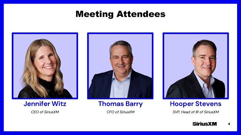 4 4 Meeting Attendees Jennifer Witz CEO of SiriusXM Hooper Stevens SVP, Head of IR of SiriusXM Thomas Barry CFO of SiriusXM