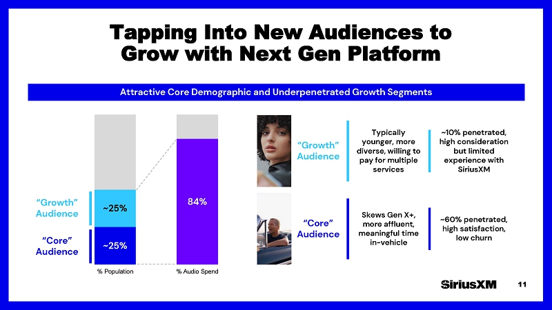 10 Super - Serving Our Strong Core Subscribers Leading Subscription Business Positioned For the Future Creating a More Seamless, Personalized Experience Modernizing Our Brand and Offering New Price Points $9.99 New Streaming Only Price Continuing to deliver differentiated content to our loyal, passionate subscribers Delivering a unified, personalized experience in - and out - of - vehicle 34 Million Total SiriusXM Paid Subscribers 1.6% Near Record Low Churn 33%+ Of New SiriusXM Vehicles Equipped w/ 360L Dec 14 th New Streaming Experience Launching new price points and plans to attract more listeners and demographics All Access Streaming Only