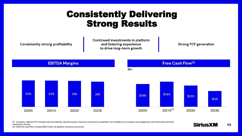 12 SiriusXM Media is a Leader in Digital Ad - Supported Audio $1.8 Billion Total SiriusXM Ad Revenue (1) 150 Million Total Listeners (2) 1 in 2 Americans 18+ #1 In Ad - Supported Share of Ear 90 Million Monthly Digital Audio Listeners Reach 66% Of All Digital Inventory 45 Million Monthly Listeners Most Shows Ranked in the Top 50 #1 Podcast Network with Women Capturing Opportunities in Ad - Based Platforms STREAMING NETWORK PODCAST NETWORK (1) LTM as of September 30, 2023 (2) Comscore Media Metrix, July 2023; Nielsen SiriusXM Custom Study, Fall 2021; Triton Podcast Metrics, August 2023; Edison Research Decem be r 2021 (National Telephone Survey, Podcast Consumer Tracker, Infinite Dial 2023)