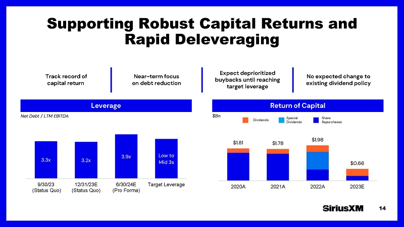 13 32% 32% 31% 31% 2020A 2021A 2022A 2023E Consistently Delivering Strong Results Strong FCF generation Consistently strong profitability Continued investments in platform and listening experience to drive long - term growth EBITDA Margins $1.66 $1.83 $1.55 $1.15 2020A 2021A 2022A 2023E Free Cash Flow (1) $Bn (2) (1) Company - defined FCF includes cash provided by operations plus insurance recoveries on satellites, net of additions to property a nd equipment, and restricted and other investment activity (2) 2021 free cash flow includes $225 million of satellite insurance recoveries