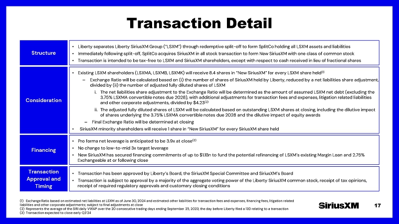 17 Transaction Detail Structure • Liberty separates Liberty SiriusXM Group (“LSXM”) through redemptive split - off to form SplitCo holding all LSXM assets and liabi lities • Immediately following split - off, SplitCo acquires SiriusXM in all stock transaction to form New SiriusXM with one class of commo n stock • Transaction is intended to be tax - free to LSXM and SiriusXM shareholders, except with respect to cash received in lieu of fracti onal shares Consideration • Existing LSXM shareholders (LSXMA, LSXMB, LSXMK) will receive 8.4 shares in “New SiriusXM” for every LSXM share held (1) ‒ Exchange Ratio will be calculated based on (i) the number of shares of SiriusXM held by Liberty, reduced by a net liabilities sh are adjustment, divided by (ii) the number of adjusted fully diluted shares of LSXM i. The net liabilities share adjustment to the Exchange Ratio will be determined as the amount of assumed LSXM net debt (excludi ng the 3.75% LSXMA convertible notes due 2028), with additional adjustments for transaction fees and expenses, litigation related li abi lities and other corporate adjustments, divided by $4.23 (2) ii. The adjusted fully diluted shares of LSXM will be calculated based on outstanding LSXM shares at closing, including the dilut ive impact of shares underlying the 3.75% LSXMA convertible notes due 2028 and the dilutive impact of equity awards ‒ Final Exchange Ratio will be determined at closing • SiriusXM minority shareholders will receive 1 share in “New SiriusXM” for every SiriusXM share held Financing • Pro forma net leverage is anticipated to be 3.9x at close (3) • No change to low - to - mid 3x target leverage • New SiriusXM has secured financing commitments of up to $1.1Bn to fund the potential refinancing of LSXM’s existing Margin Loan and 2.75% Exchangeable at or following close Transaction Approval and Timing • Transaction has been approved by Liberty’s Board, the SiriusXM Special Committee and SiriusXM’s Board • Transaction is subject to approval by a majority of the aggregate voting power of the Liberty SiriusXM common stock, receipt of tax opinions, receipt of required regulatory approvals and customary closing conditions (1) Exchange Ratio based on estimated net liabilities at LSXM as of June 30, 2024 and estimated other liabilities for transaction fe es and expenses, financing fees, litigation related liabilities and other corporate adjustments; subject to final adjustments at close (2) Represents the average of the SIRI daily VWAP over the 20 consecutive trading days ending September 25, 2023, the day before Lib erty filed a 13D relating to a transaction (3) Transaction expected to close early Q3’24