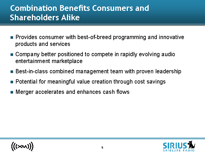 statements about the benefits of the business combination transaction involving Sirius Satellite