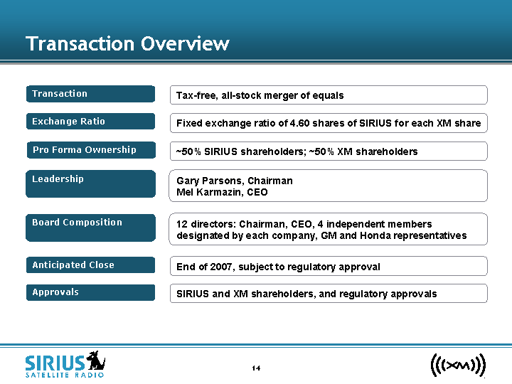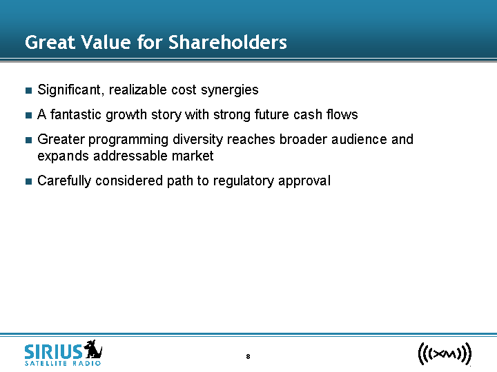 transaction involving Sirius Satellite Radio Inc. and XM Satellite Radio Holdings Inc., including potential synergies and cost